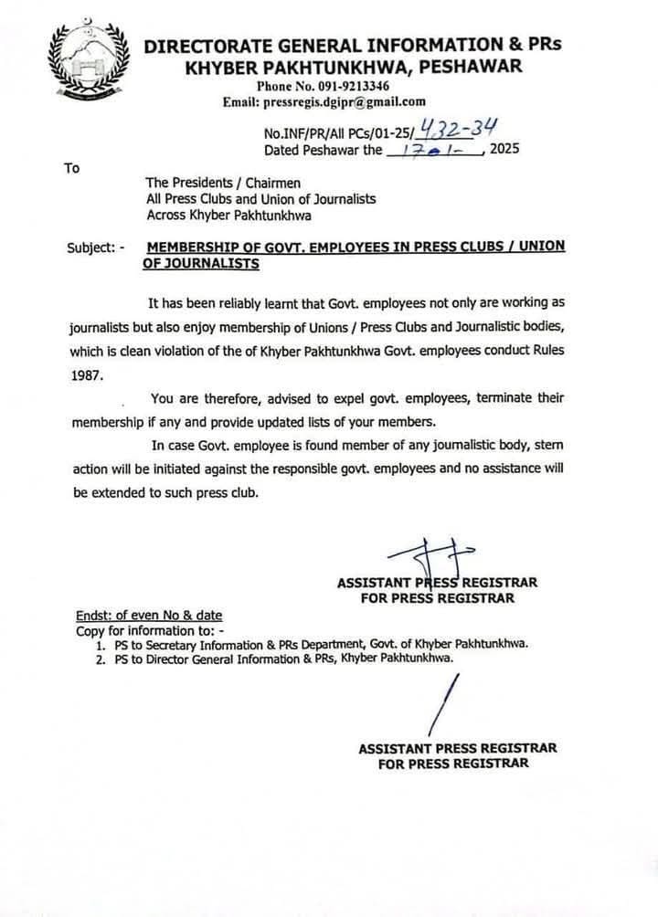 تمام پریس کلب فی الفور سرکاری ملازمین کو اپنی باڈی/پریس کلب سے خارج کریں اور ہمیں اپنی اپڈیٹ لسٹ فراہم کی جاۓ