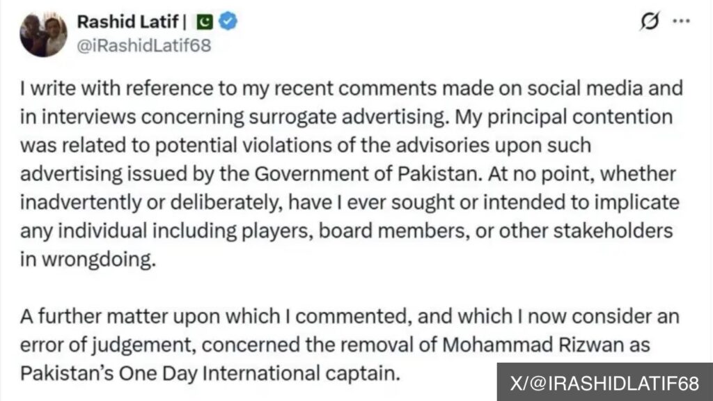 دراصل سابق کپتان راشد لطیف نے سنیچر کو ایکس پر جاری اپنے بیان میں کہا کہ وہ سروگیٹ بیٹنگ کمپنیوں اور محمد رضوان کو ٹیم کی کپتانی سے ہٹانے سے متعلق دیے گئے بیانات پر معذرت خواہ ہیں۔